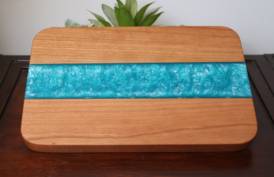 Each board is made from solid wood and finished with a vibrant, ocean-blue resin inlay that adds a modern, coastal feel while still showcasing the warmth and grain of the wood. Perfect for serving cheeses, appetizers, small bites, or as a decorative countertop piece.