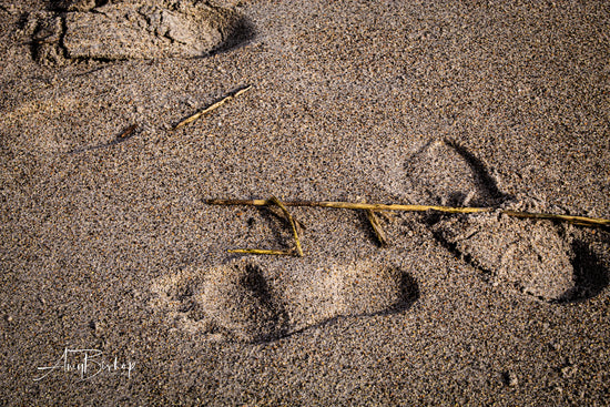 Fine art photography print, matted. Footprints in the sand at Wrightsville Beach, North Carolina.