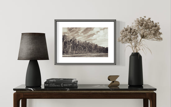 Fine art photography print, matted. The great Carolina Pines are celebrated in this gorgeous black and white landscape photo. -Available in 3 sizes; 11x14 print with 16x20 matte, 8x10 print with 11x14, 5x7 print with 8x10 matte.