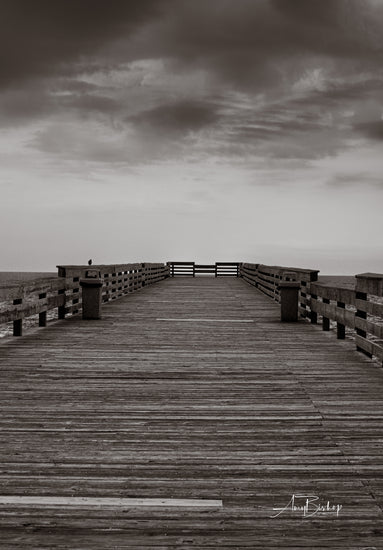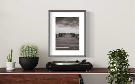 Fine art photography print, matted. Taken from the Crystal Pier in North Carolina; this moody black and white image explores feelings of tranquility through solitude.